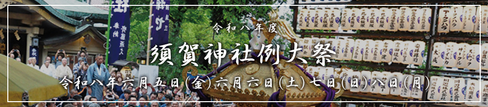 毎年六月に行われる御祭礼は、古くは四谷の「天王祭り」といわれ、江戸の五大祭りの一つとして有名でありました。社名の須賀とは、須佐之男命が出雲の国の簸の川上に、八俣の大蛇を討ち平らげ拾い「吾れ此の地に来たりて心須賀、須賀し」と宣り給いて、宮居を占め給いし故事に基づき名付けられた名称です。